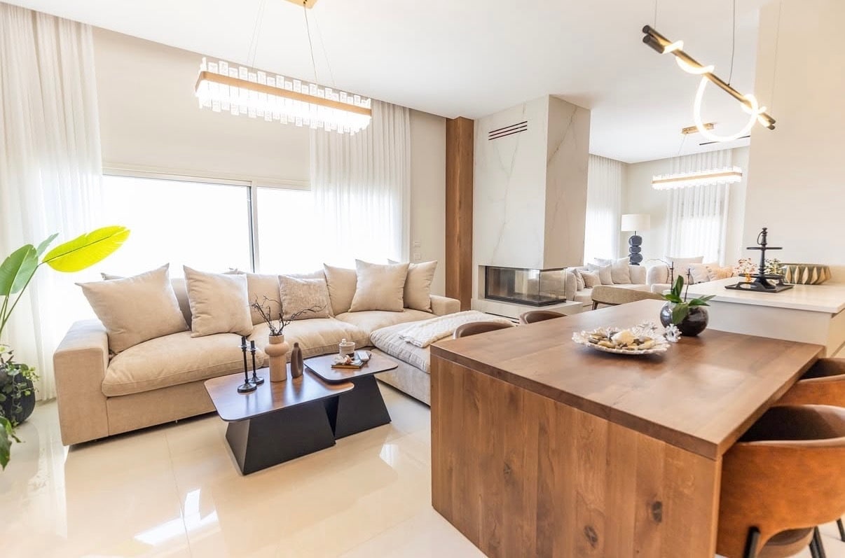 The mix of warm wood tones (island/dining surface) and soft beige upholstery creates a welcoming, upscale feel without looking trendy. This is a reliable formula for timeless interiors.