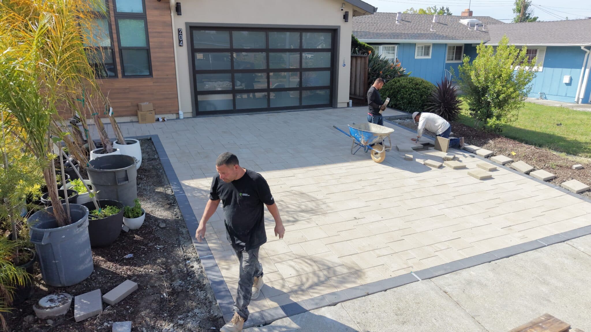 The project shown features a large paver surface being installed in front of a garage—an expansive, modern driveway/forecourt layout with a contrasting border course and crew members setting pavers carefully.